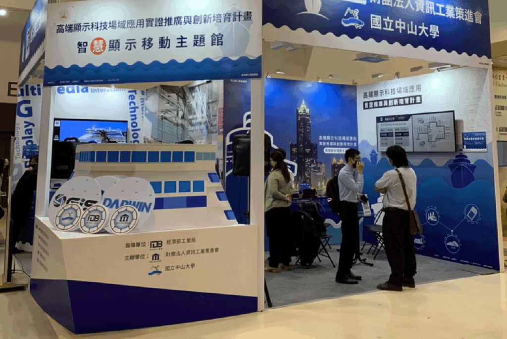 - 入口意象: 利用木作與輸出,將展館入口打造為一艘巨大的藍色郵輪,上方標示「經濟部工業局」與「智慧顯示移動主題館」字樣,營造出航意象 。